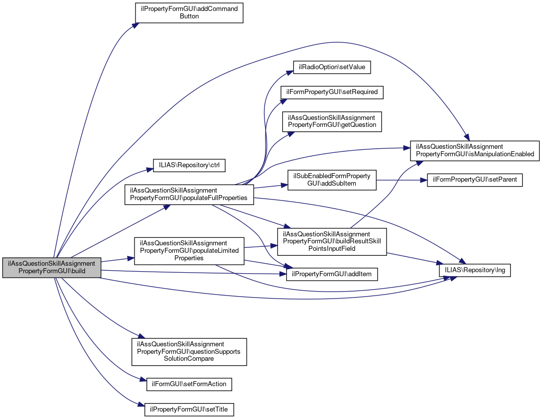 Here is the call graph for this function:| ilAssQuestionSkillAssignmentPropertyFormGUI::build | ( | ) |