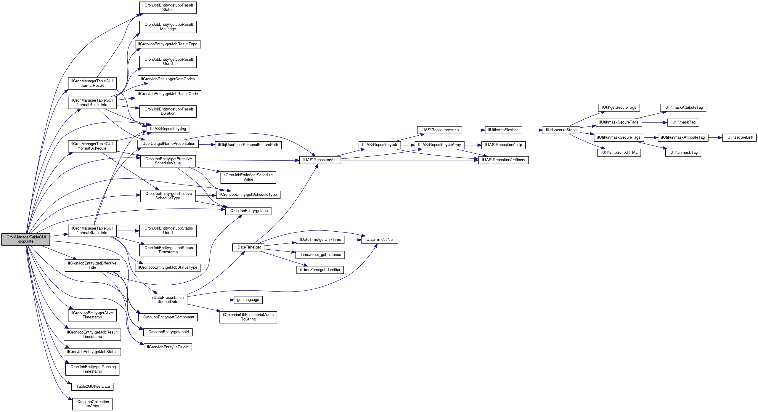 References formatResult(), formatResultInfo(), formatSchedule(), formatStatusInfo(), ilCronJobEntity\getAliveTimestamp(), ilCronJobEntity\getComponent(), ilCronJobEntity\getEffectiveScheduleType(), ilCronJobEntity\getEffectiveScheduleValue(), ilCronJobEntity\getEffectiveTitle(), ilCronJobEntity\getJob(), ilCronJobEntity\getJobId(), ilCronJobEntity\getJobResultStatus(), ilCronJobEntity\getJobResultTimestamp(), ilCronJobEntity\getJobStatus(), ilCronJobEntity\getRunningTimestamp(), ilCronJobEntity\getScheduleType(), ilCronJobEntity\isPlugin(), ILIAS\Repository\lng(), ilTable2GUI\setData(), and ilCronJobCollection\toArray().