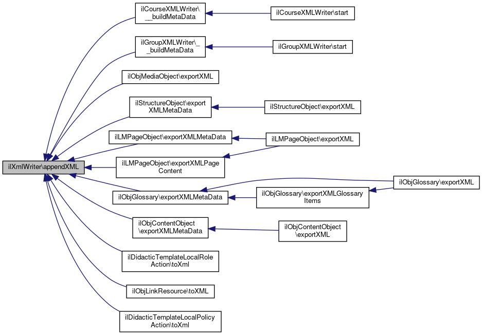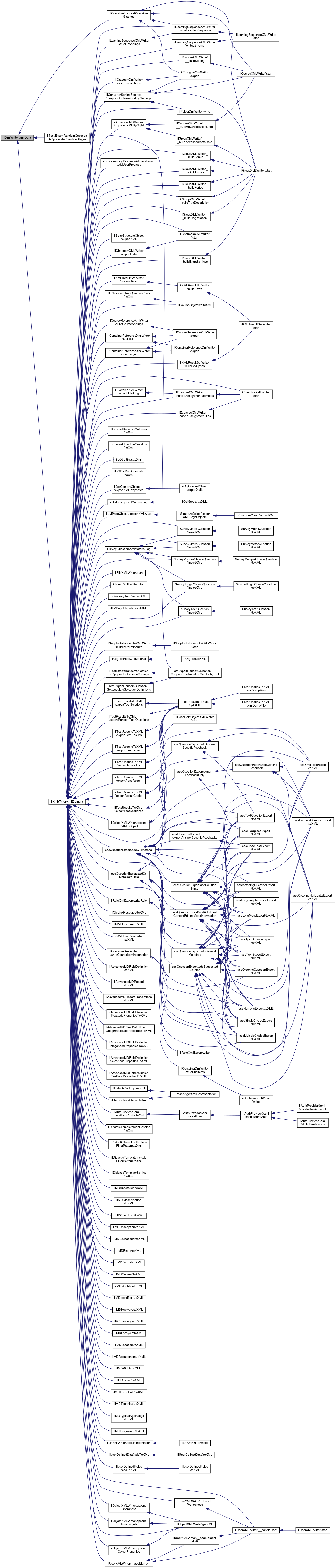 Referenced by ilUserXMLWriter\__addElement(), ilGroupXMLWriter\__buildAdmin(), ilGroupXMLWriter\__buildExtraSettings(), ilGroupXMLWriter\__buildMember(), ilGroupXMLWriter\__buildPeriod(), ilGroupXMLWriter\__buildRegistration(), ilCourseXMLWriter\__buildSetting(), ilGroupXMLWriter\__buildTitleDescription(), ilUserXMLWriter\__handlePreferences(), ilUserXMLWriter\__handleUser(), ilAdvancedMDValues\_appendXMLByObjId(), ilContainerSortingSettings\_exportContainerSortingSettings(), ilLMPageObject\_exportXMLAlias(), ilLPXmlWriter\addLPInformation(), SurveyQuestion\addMaterialTag(), ilObjSurvey\addMaterialTag(), ilAdvancedMDFieldDefinitionGroupBased\addPropertiesToXML(), ilAdvancedMDFieldDefinitionFloat\addPropertiesToXML(), ilAdvancedMDFieldDefinitionInteger\addPropertiesToXML(), ilAdvancedMDFieldDefinitionText\addPropertiesToXML(), ilAdvancedMDFieldDefinitionSelect\addPropertiesToXML(), assQuestionExport\addQTIMaterial(), ilObjTest\addQTIMaterial(), assQuestionExport\addQtiMetaDataField(), ilDataSet\addRecordsXml(), assQuestionExport\addSolutionHints(), assQuestionExport\addSuggestedSolution(), ilUserDefinedData\addToXML(), ilUserDefinedFields\addToXML(), ilDataSet\addTypesXml(), ilSoapLearningProgressAdministration\addUserProgress(), ilObjectXMLWriter\appendObjectProperties(), ilObjectXMLWriter\appendOperations(), ilObjectXMLWriter\appendPathToObject(), ilXMLResultSetWriter\appendRow(), ilObjectXMLWriter\appendTimeTargets(), ilExerciseXMLWriter\attachMarking(), ilXMLResultSetWriter\buildColSpecs(), ilCourseReferenceXmlWriter\buildCourseSettings(), ilSoapInstallationInfoXMLWriter\buildInstallationInfo(), ilContainerReferenceXmlWriter\buildTarget(), ilContainerReferenceXmlWriter\buildTitle(), ilCategoryXmlWriter\buildTranslations(), ilAuthProviderSaml\buildUserAttributeXml(), ilTestResultsToXML\exportActiveIDs(), ilChatroomXMLWriter\exportData(), ilTestResultsToXML\exportPassResult(), ilTestResultsToXML\exportRandomTestQuestions(), ilTestResultsToXML\exportResultCache(), ilTestResultsToXML\exportTestResults(), ilTestResultsToXML\exportTestSequence(), ilTestResultsToXML\exportTestSolutions(), ilTestResultsToXML\exportTestTimes(), ilSoapStructureObject\exportXML(), ilLMPageObject\exportXML(), ilGlossaryTerm\exportXML(), ilObjContentObject\exportXMLProperties(), ilObjectXMLWriter\getXML(), ilExerciseXMLWriter\handleAssignmentFiles(), ilExerciseXMLWriter\handleAssignmentMembers(), SurveyTextQuestion\insertXML(), SurveyMultipleChoiceQuestion\insertXML(), SurveySingleChoiceQuestion\insertXML(), SurveyMetricQuestion\insertXML(), SurveyMatrixQuestion\insertXML(), ilTestExportRandomQuestionSet\populateCommonSettings(), ilTestExportRandomQuestionSet\populateSelectionDefinitions(), ilChatroomXMLWriter\start(), ilSoapRoleObjectXMLWriter\start(), ilForumXMLWriter\start(), ilExerciseXMLWriter\start(), ilFileXMLWriter\start(), ilDidacticTemplateIncludeFilterPattern\toXml(), ilDidacticTemplateExcludeFilterPattern\toXml(), ilWebLinkItem\toXML(), ilMDFormat\toXML(), ilWebLinkParameter\toXML(), ilMDEntity\toXML(), ilMDIdentifier\toXML(), ilMDIdentifier_\toXML(), ilMDLocation\toXML(), ilMDDescription\toXML(), ilMDKeyword\toXML(), ilDidacticTemplateIconHandler\toXml(), ilMDLanguage\toXML(), ilMDTaxon\toXML(), ilMDAnnotation\toXML(), ilMDTypicalAgeRange\toXML(), ilMDTaxonPath\toXML(), ilObjLinkResource\toXML(), ilMDLifecycle\toXML(), ilMDContribute\toXML(), ilMDRights\toXML(), ilAdvancedMDRecordTranslations\toXML(), ilLOTestAssignments\toXml(), ilMDClassification\toXML(), ilMDRequirement\toXML(), ilMultilingualism\toXml(), ilLORandomTestQuestionPools\toXml(), ilMDTechnical\toXML(), ilMDGeneral\toXML(), ilCourseObjectiveMaterials\toXml(), ilDidacticTemplateSetting\toXml(), ilLOSettings\toXml(), ilCourseObjective\toXml(), ilMDEducational\toXML(), ilAdvancedMDRecord\toXML(), ilCourseObjectiveQuestion\toXml(), ilAdvancedMDFieldDefinition\toXML(), ilFolderXmlWriter\write(), ilContainerXmlWriter\writeCourseItemInformation(), ilLearningSequenceXMLWriter\writeLearningSequence(), ilLearningSequenceXMLWriter\writeLPSettings(), ilLearningSequenceXMLWriter\writeLSItems(), and ilRoleXmlExport\writeRole().