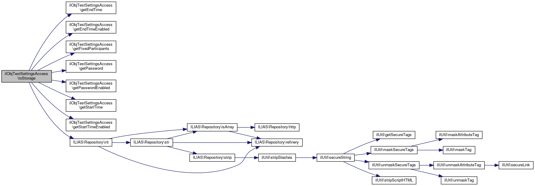 Here is the call graph for this function:| ilObjTestSettingsAccess::toStorage | ( | ) |
