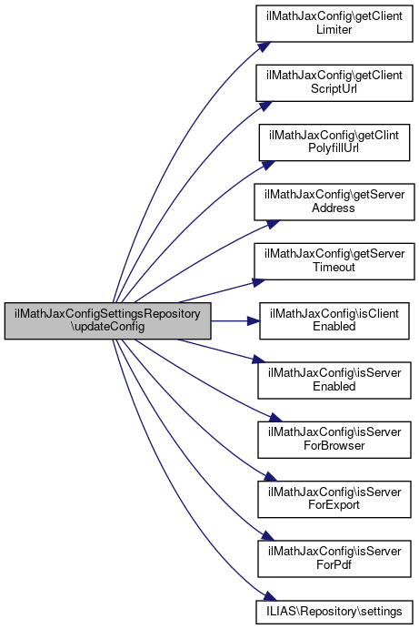 References ilMathJaxConfig\getClientLimiter(), ilMathJaxConfig\getClientScriptUrl(), ilMathJaxConfig\getClintPolyfillUrl(), ilMathJaxConfig\getServerAddress(), ilMathJaxConfig\getServerTimeout(), ilMathJaxConfig\isClientEnabled(), ilMathJaxConfig\isServerEnabled(), ilMathJaxConfig\isServerForBrowser(), ilMathJaxConfig\isServerForExport(), ilMathJaxConfig\isServerForPdf(), and ILIAS\Repository\settings().