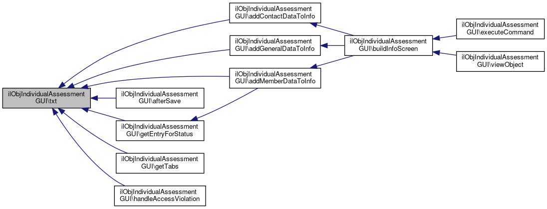 ilObjIndividualAssessmentGUI: ilPermissionGUI ilObjIndividualAssessmentGUI: ilInfoScreenGUI ilObjIndividualAssessmentGUI: ilObjectCopyGUI ilObjIndividualAssessmentGUI: ilCommonActionDispatcherGUI ilObjIndividualAssessmentGUI: ilIndividualAssessmentSettingsGUI ilObjIndividualAssessmentGUI: ilIndividualAssessmentMembersGUI ilObjIndividualAssessmentGUI: ilLearningProgressGUI ilObjIndividualAssessmentGUI: ilExportGUI ilObjIndividualAssessmentGUI: ilObjectMetaDataGUI