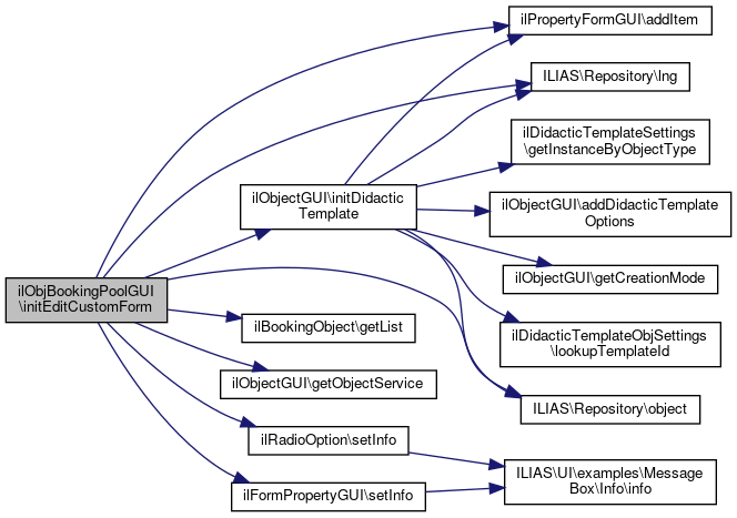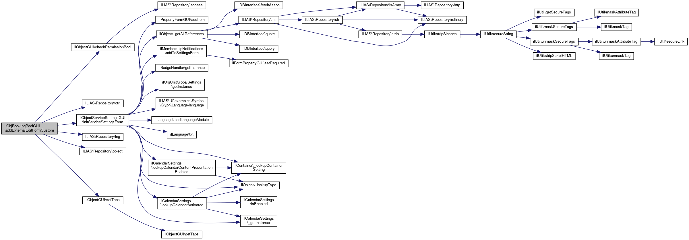 Here is the call graph for this function:| ilObjBookingPoolGUI::addExternalEditFormCustom | ( | ilPropertyFormGUI | $form | ) |