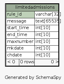 | Table studipjlu_31.limitedadmissions | Generated by SchemaSpy |