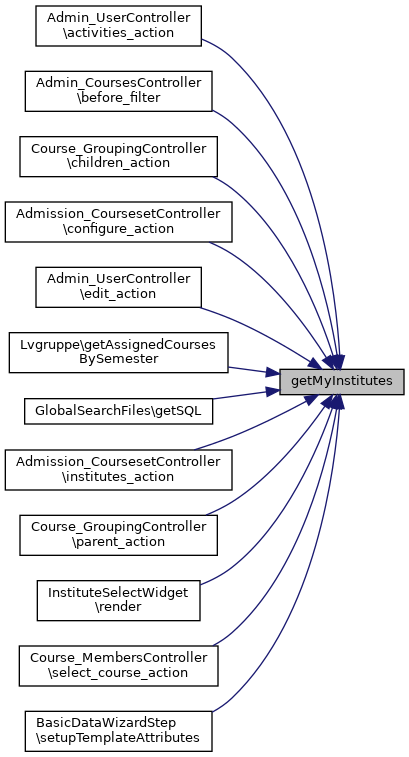 returns an array of all institutes to which the given user belongs, ordered by faculties and name. The user role for each institute is included